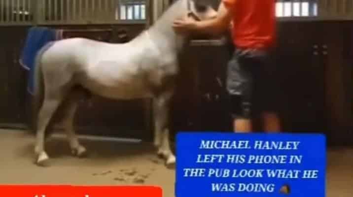 The video contains two captions reading “Michael Hanley left his phone in the pub look what he was doing” and “Always keep a password on your phone,” giving an impression that the video was leaked from a phone accidentally left by the person who filmed themselves having sex with the horse.